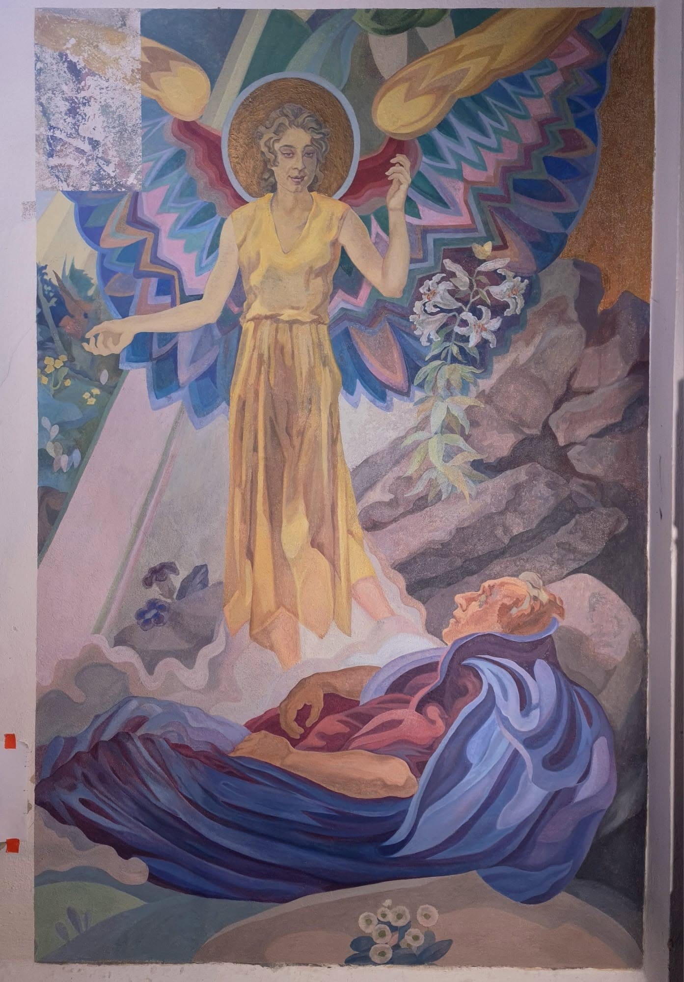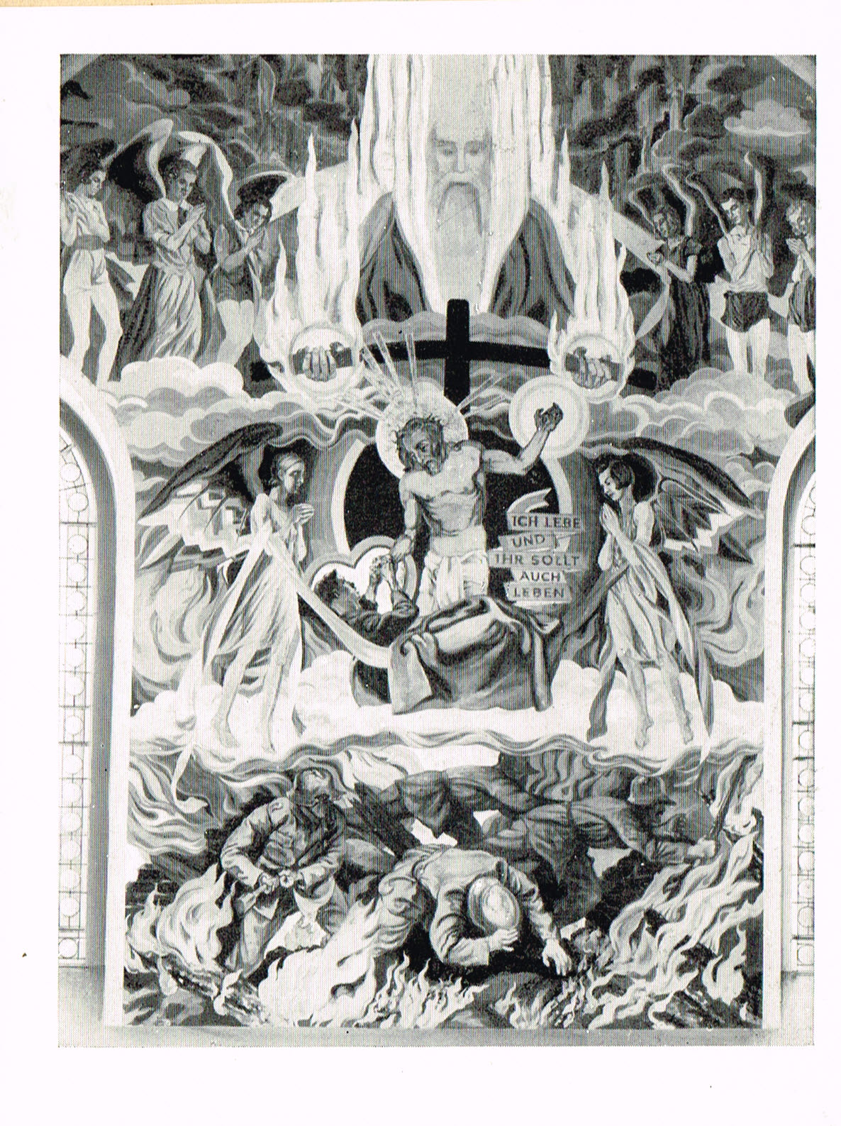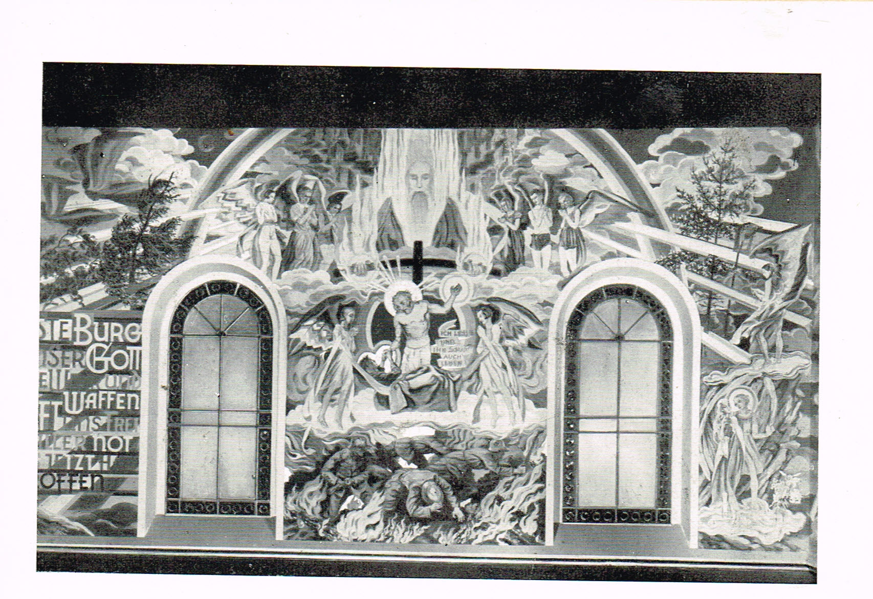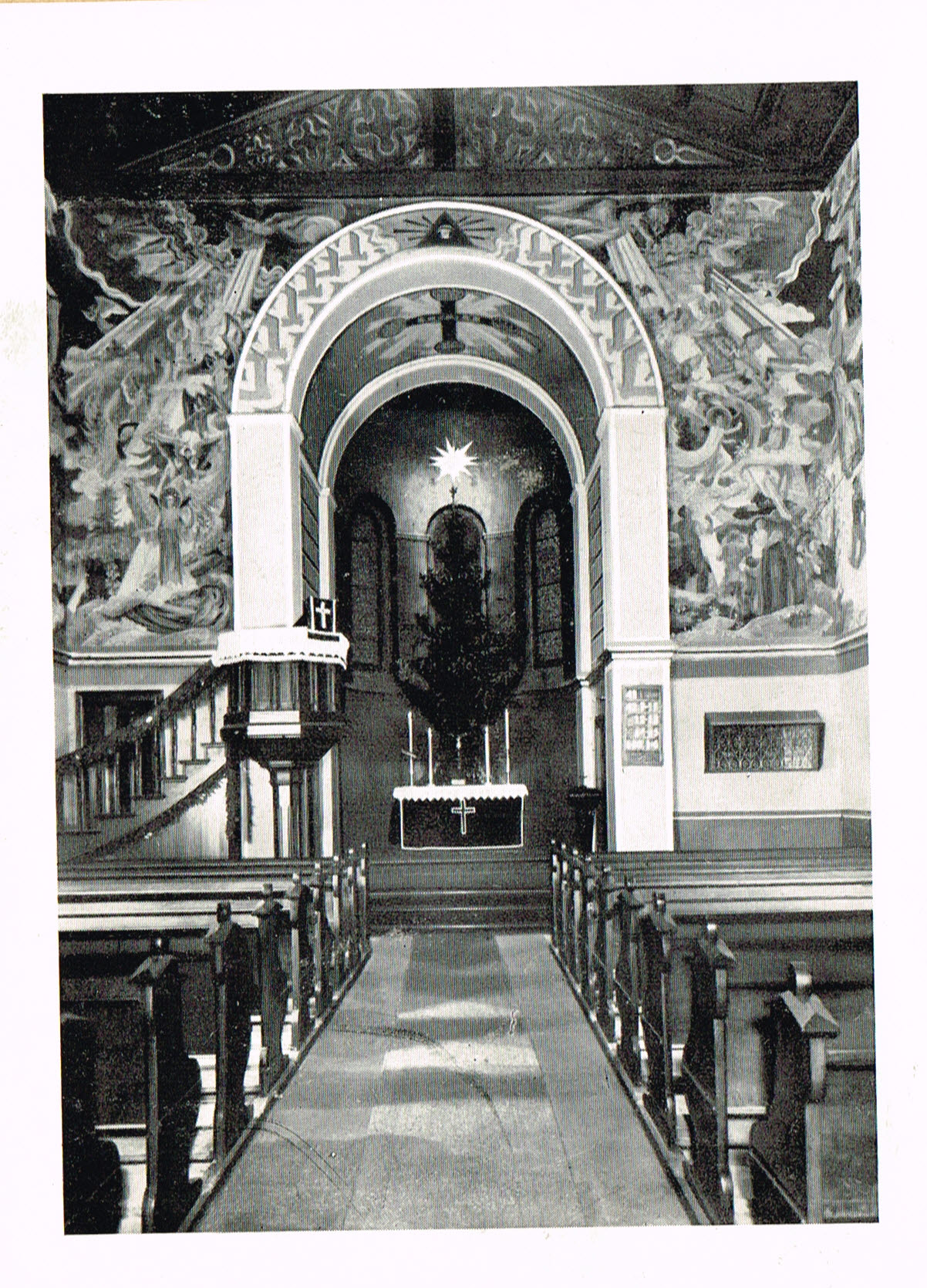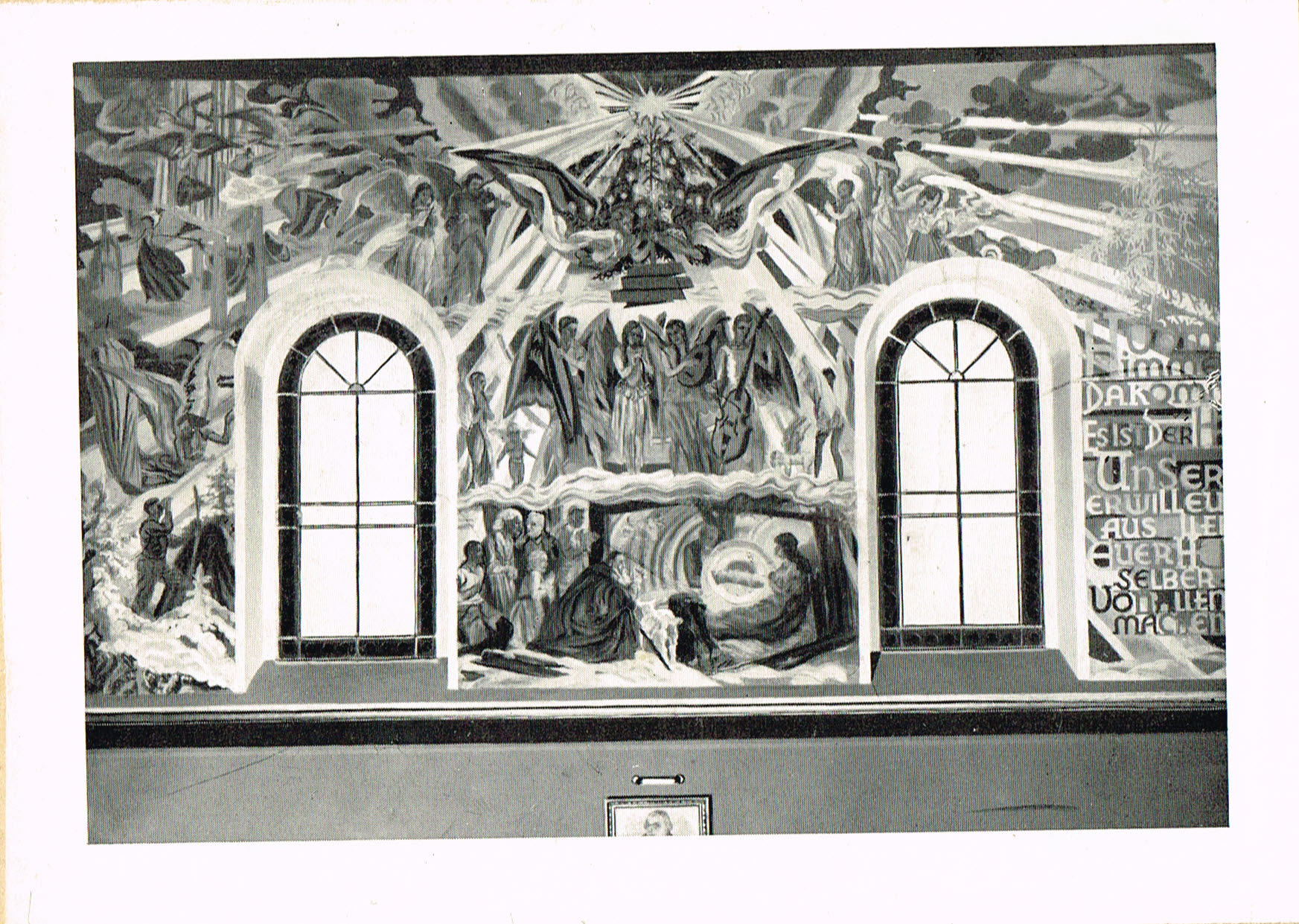 Ze wspomnień Ericha Heinke (przekład R. Szumielewicz): „W ciągu lata 1930 ściana, za którą wbudowana jest apsyda, otrzymała dwa wielkie malowidła. Na lewo, [sen] św. Jakuba o drabinie niebiańskiej, – na prawo zapowiedź nowego przymierza – objawienie się anioła pasterzom i zastępy niebieskie. Łuk apsydy został pomalowany w kolorze. Pozostałe ściany kościoła pokryto ornamentyka delikatnie białą. Pod parapetami okien znajdujących się w ścianach wzdłużnych kościoła umieszczono wstęgi z wypisanymi aforyzmami a ściany pod nimi wymalowano na zielono. Te ostatnie prace wykonał miejscowy malarz Kraus według wskazówek profesora Avenariusa. […] Całkowitego wymalowania kościoła dokonano w 1934. Wprawdzie miano to zrobić już w 1931 ale oznaczałoby to tak wielkie przemieszczenie wnętrza kościoła, że odłożono to na później. Tak wielka reorganizacja mogła być związana tylko z wielkimi uroczystościami i bardziej pasowała do jubileuszu 50-lecia kaplicy. W 1934 prof. Avenarius miał dokończyć swojej pracy. Po wielu pracach remontowych w sierpniu mógł przystąpić do jej realizacji. […] Wyjątkowym w tym dziele jest użycie przez artystę do swoich postaci podobizn mieszkańców wsi. Nadał on przez to wyraz rodzinności i bliskości życia uczuciom religijnym. ”